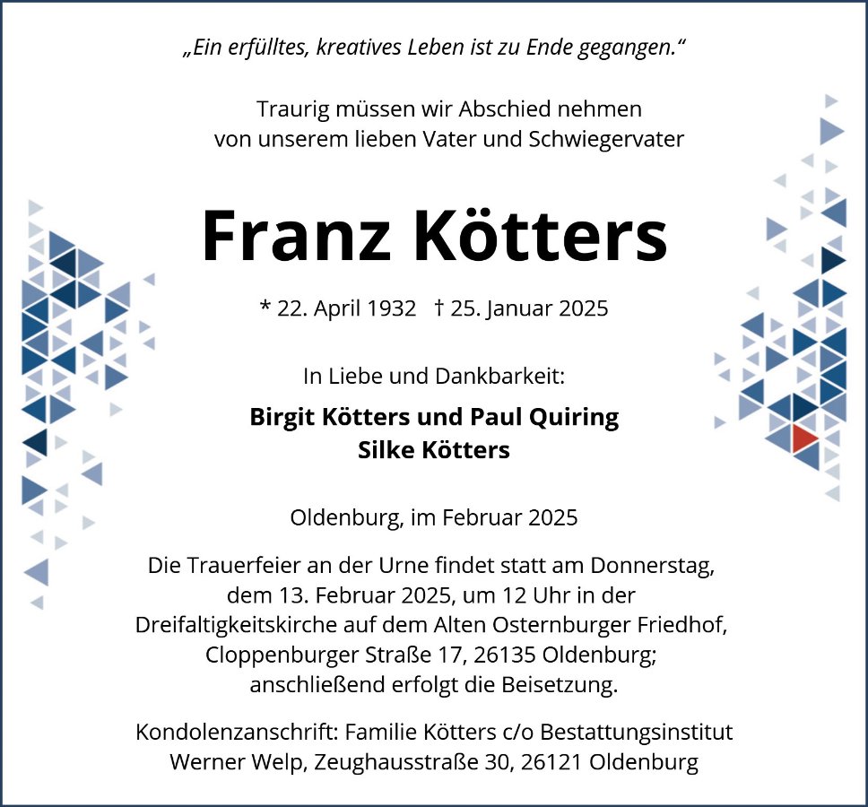 geboren am 22. April 1932 in Oldenburg gestorben am 25. Januar 2025 in Oldenburg