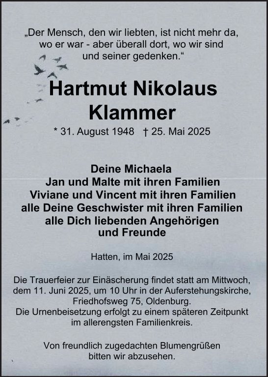 in dieser Zeit des Schmerzes wünschen wir Ihnen Kraft, den Verlust im Kreise Ihrer Liebsten zu verarbeiten. Als Zeichen unserer Anteilnahme und des Gedenkens entzünden wir dieses erste Licht. Möge diese Gedenkseite Ihnen helfen, Erinnerungen zu teilen und so das Andenken gemeinsam wachzuhalten.