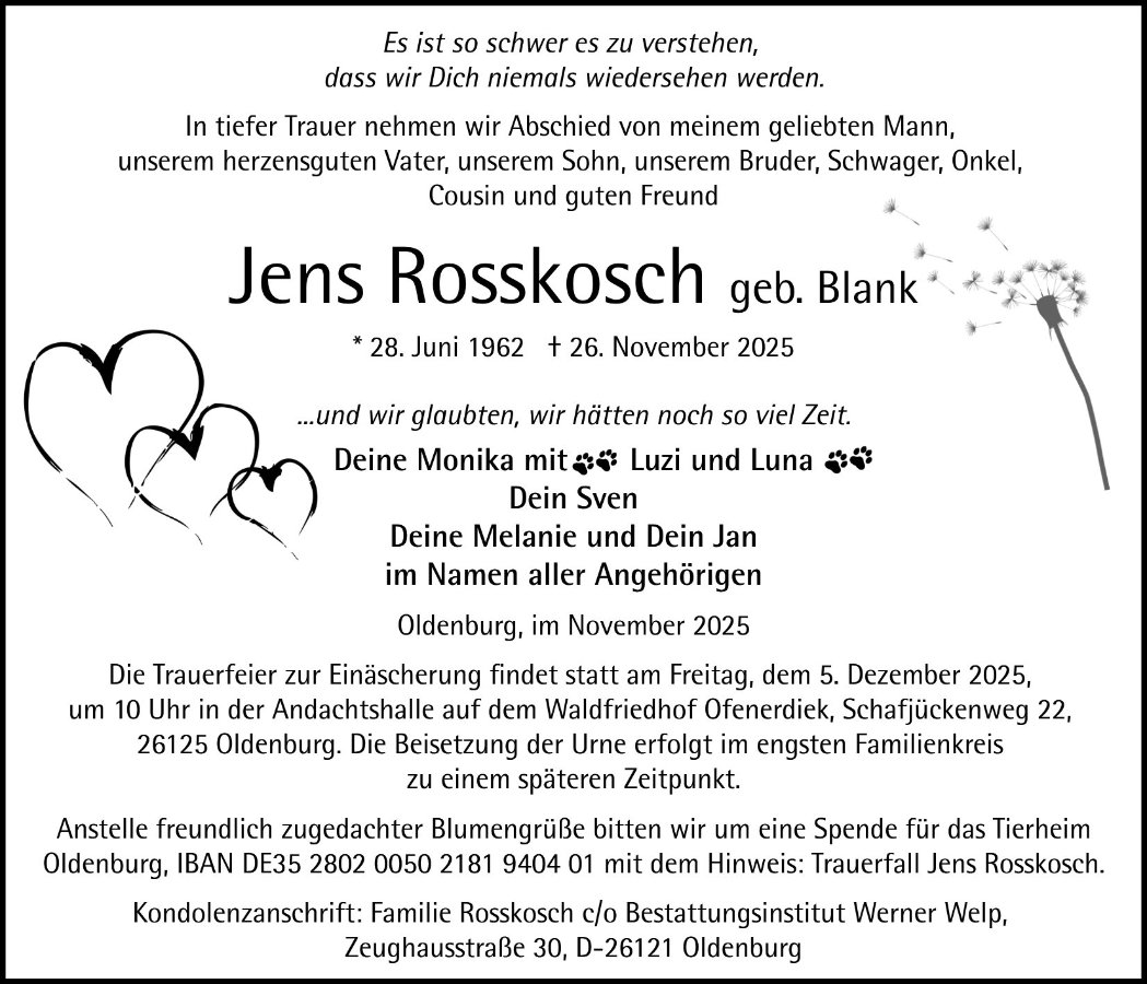 „Der Tod ordnet die Welt neu. Scheinbar hat sich nichts verändert, und doch ist alles anders geworden.“ (Antoine de Saint-Exupéry) Es macht mich unendlich traurig, dass Euch als Familie nur noch so wenig Zeit geblieben ist. Es tat gut, dass ich nochmal Jens gesprochen und umarmt haben konnte. In Gedanken bin ich in dieser schweren Zeit bei Euch, liebe Moni.