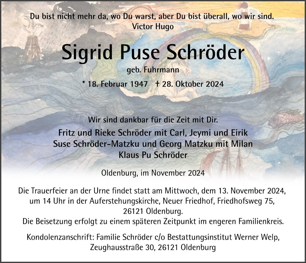 Wir wollten dich so gern demnächst wiedersehen in Oldenburg, und sind sehr traurig, dass das jetzt nicht mehr geht. Aber wir sind auch glücklich, dir begegnet zu sein, liebe Puse, du hast uns viel Schönes und Wichtiges mitgegeben, dafür danken wir dir. Du wirst immer in unseren Gedanken und Herzen sein.
